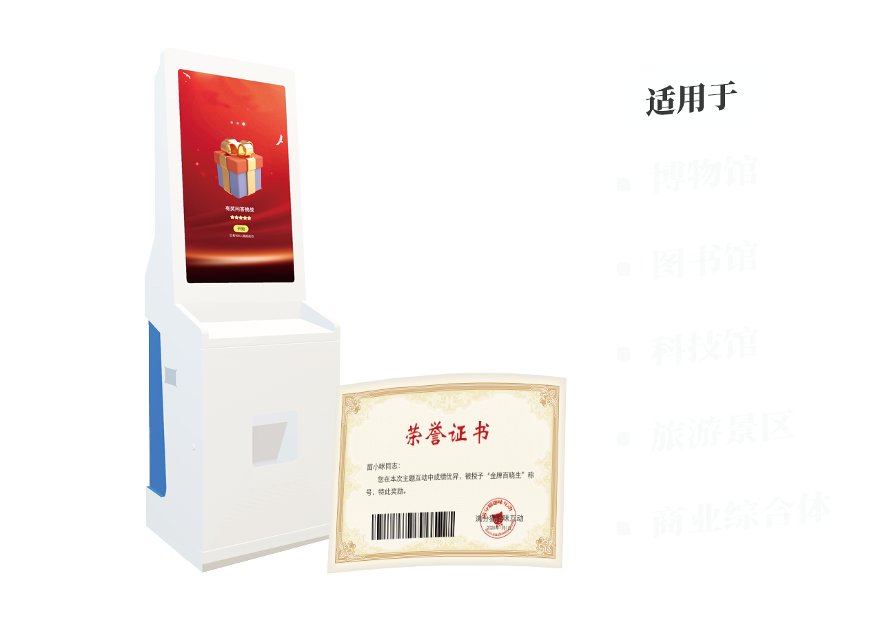 触屏答题,自动打印证书,适用于公益科普,有学习氛围的场景,如博物馆、图书馆等。